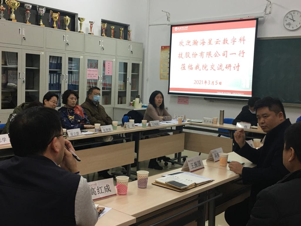 2021年3月5日,瀚海星云数字科技股份有限公司CEO高振元,项目经理翟董恒莅临公司进行专业建设交流研讨。公司党委书记王振国、经理赵春、副经理高红成、副经理常慧宾,各系主任、教研室主任、专业建设负责人及多名教师参会。