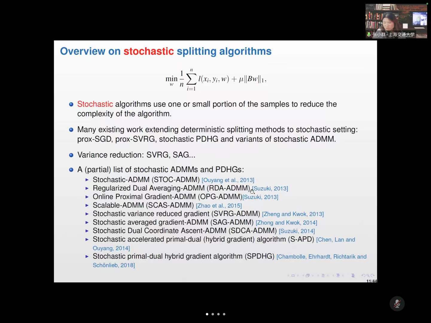 张教授的报告主要介绍随机原始-对偶分裂方法及其在成像和数据科学的应用。在这次报告中,张教授主要分享了两类求解大规模问题的随机复合优化算法,保证方差减少的随机原始-对偶分裂(SVRG-PDFP)方法和保证方差减少的随机交替方向乘子法。同时介绍了算法的收敛性分析和收敛速度估计。并通过图Lasso模型、图logistic回归模型、统计学习实例和基于L0稀疏正则化的三维图像重建等数值算例,介绍算法的应用。最后,张教授与在线师生友好互动,并对师生提出的问题进行解答。