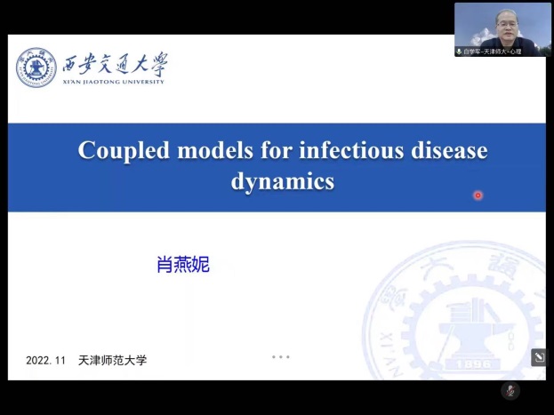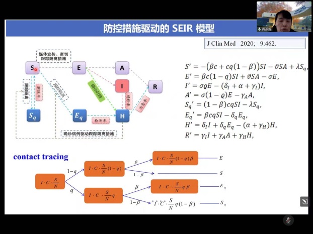 在疾病传播动力学建模中,在不同尺度上耦合模型变得具有挑战性。在本次报告中,肖教授简要介绍了人口和个人层面的建模方法。通过将传播率和疾病导致的死亡率与感染个体内的病毒载量联系起来,将宿主内动态嵌套到宿主间开发一个多尺度模型。并对最近关于新冠肺炎感染的研究,包括一个基于随机个体的四层复杂网络模型,以解释为什么儿童在新冠肺炎疫情的四次流行浪潮中扮演不同的角色进行介绍。同时,为了避免疫情爆发,设计了网络模型来检验可行的移动策略。最后,对多尺度建模方法进行总结。报告最后,肖教授在线与师生进行了友好互动,对师生提出的问题进行解答。