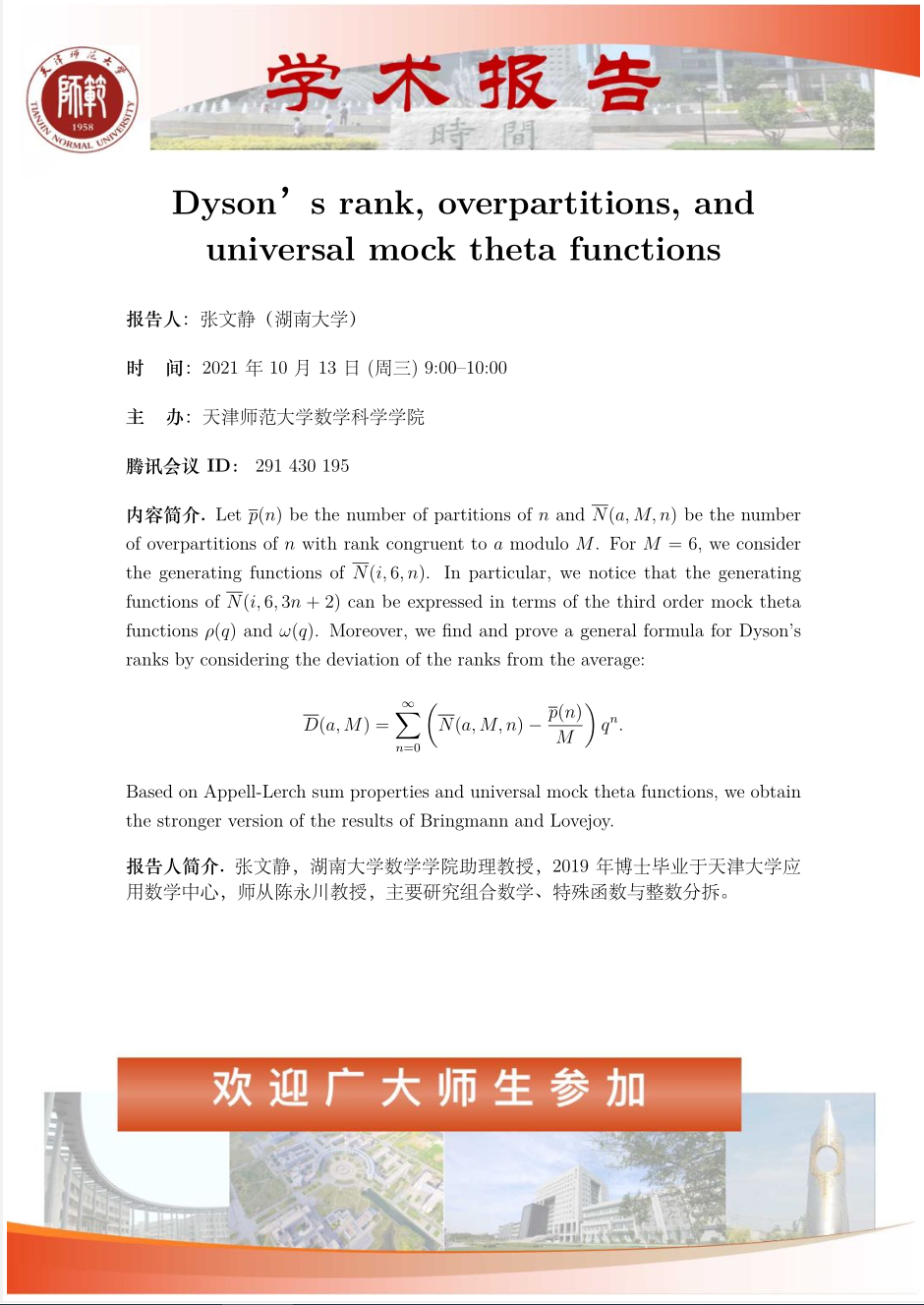 【预告】学术报告(2021-23)10月13日报告——Dyson's rank,overpartitions,and universal mock theta functions