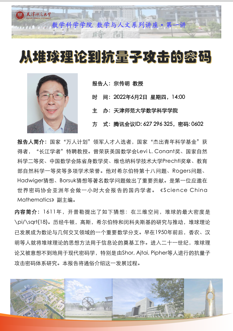 【预告】学术报告(2022-8)6月2日报告--从堆球理论到抗量子攻击的密码
