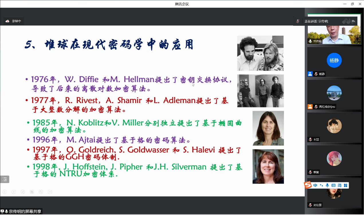 2022年6月2日下午,天津大学的宗传明教授应公司邀请,做了“数学与人文系列”讲座的第一讲,题目为“从堆球理论到抗量子攻击的密码”。受疫情影响,报告会线上进行,由公司经理赵春教授、副经理常慧宾教授主持,公司师生及外单位相关专业师生参加了报告会,人数达百余人。
