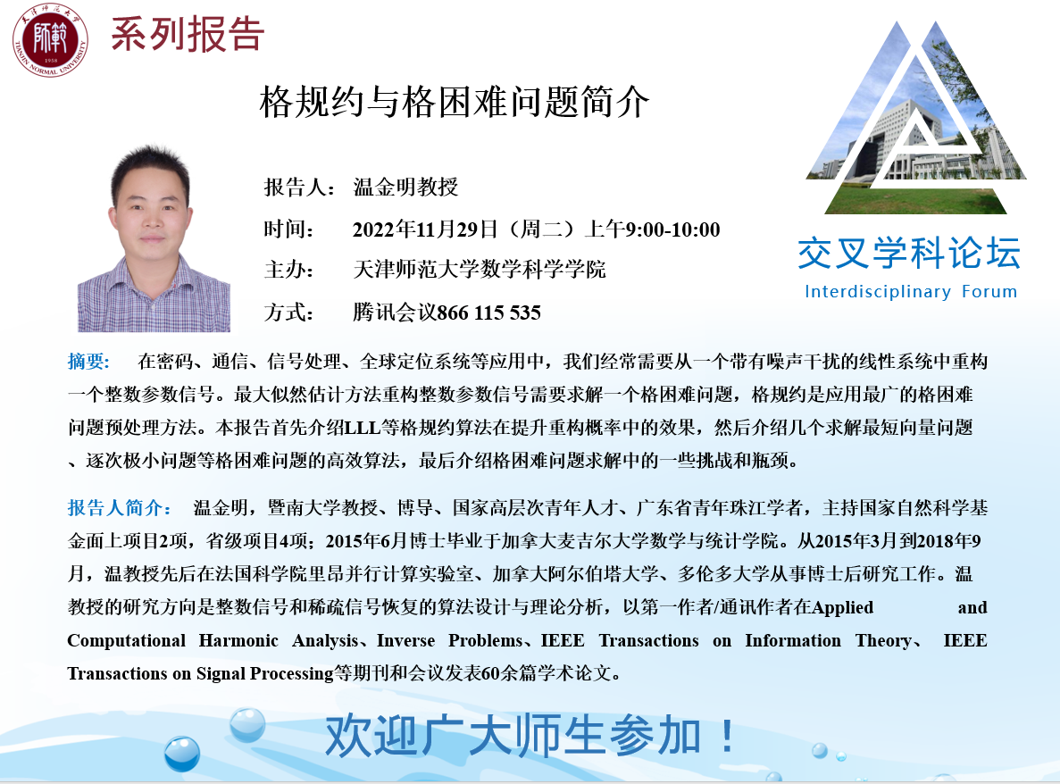 【预告】学术报告(2022-19)11月29日报告--格规约与格困难问题简介