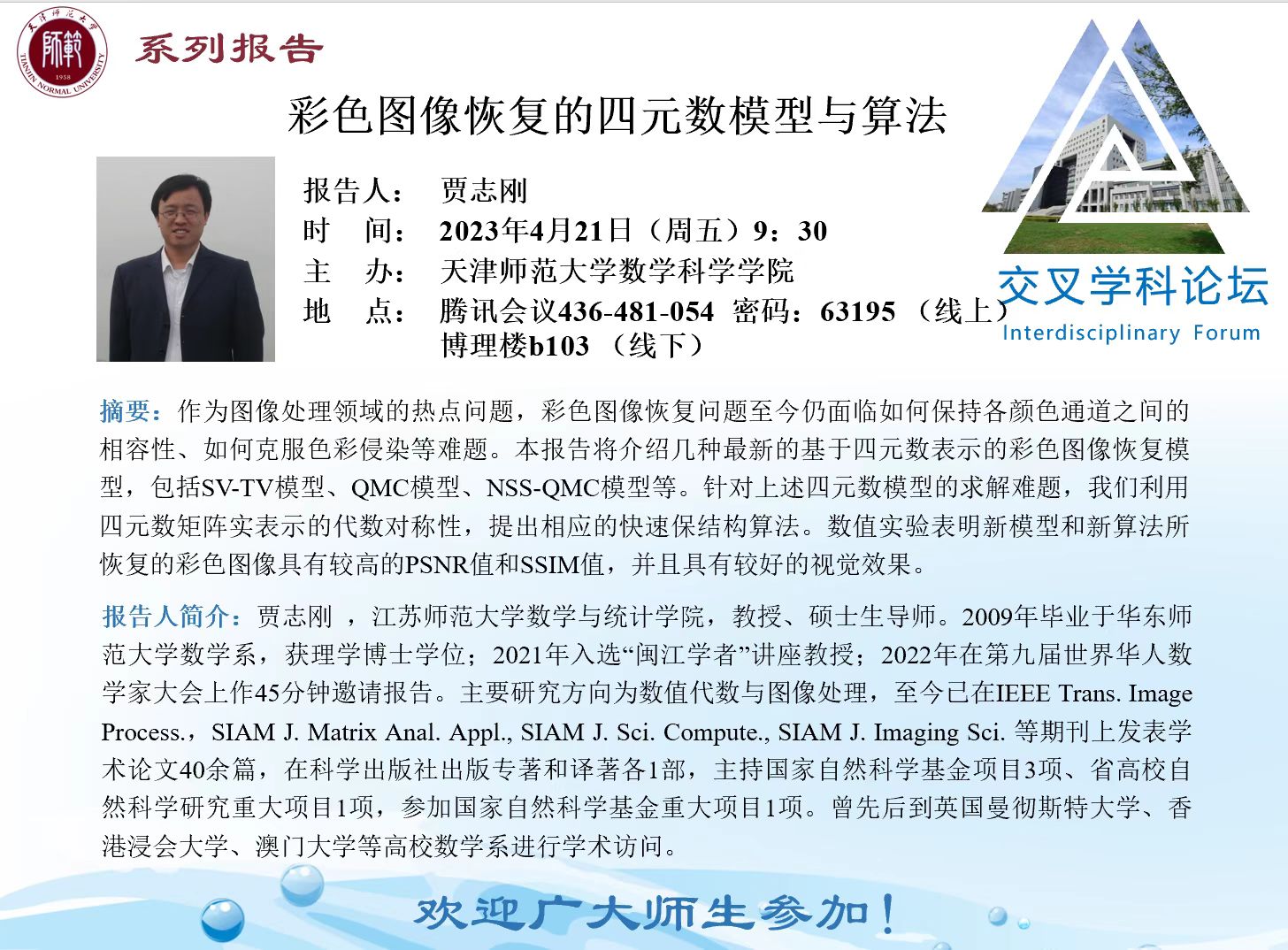 【预告】学术报告(2023-4)4月21日——彩色图像恢复的四元数模型与算法