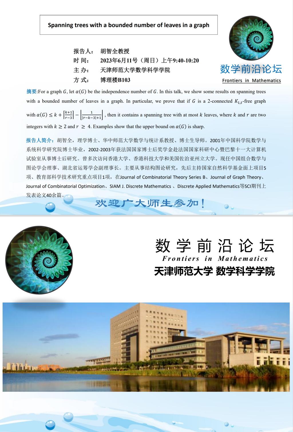 【预告】学术报告(2023-10)6月11日——Spanning trees with a bounded number of leaves in a graph