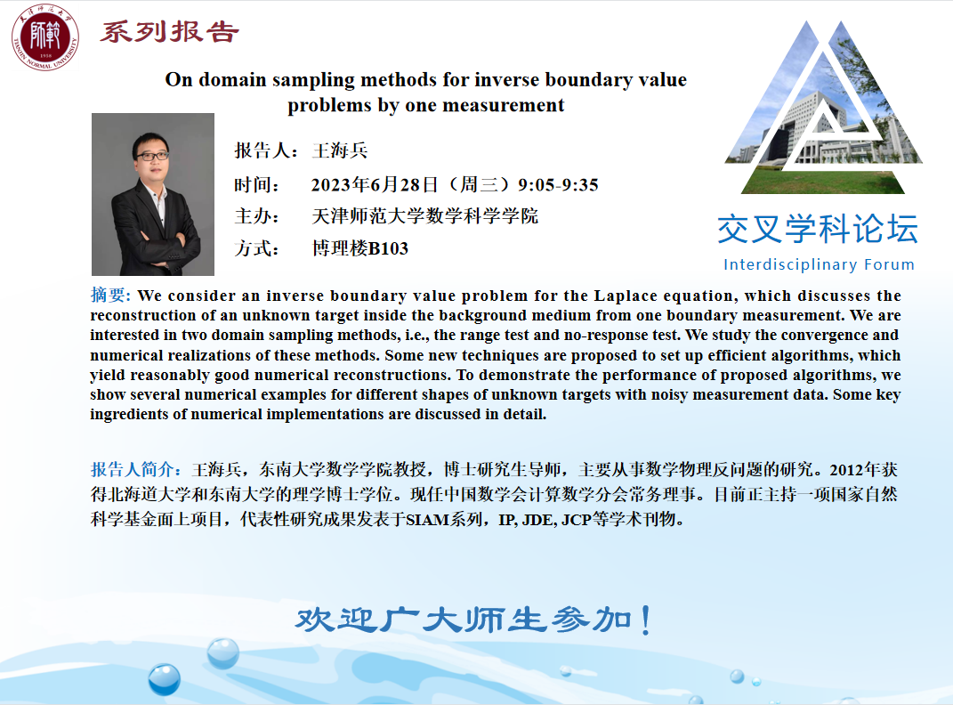 【预告】学术报告(2023-16)6月28日——On domain sampling methods for inverse boundary value problems by one measurement