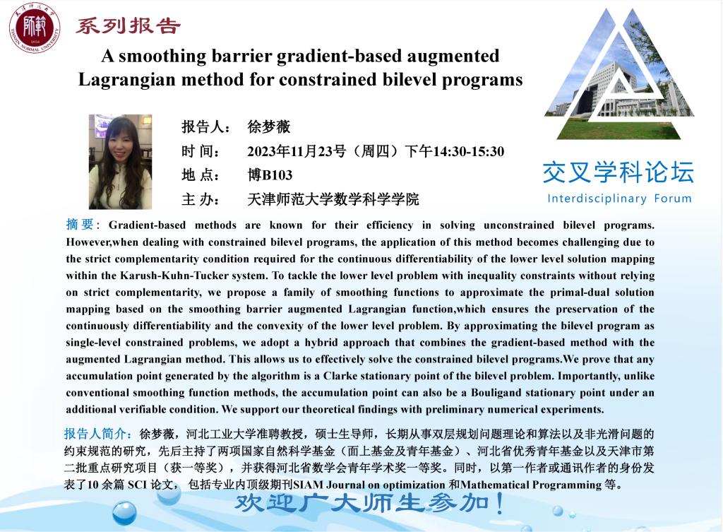【预告】学术报告(2023-39)11月23日— A smoothing barrier gradient-based augmented Lagrangian method for constrained bilevel programs