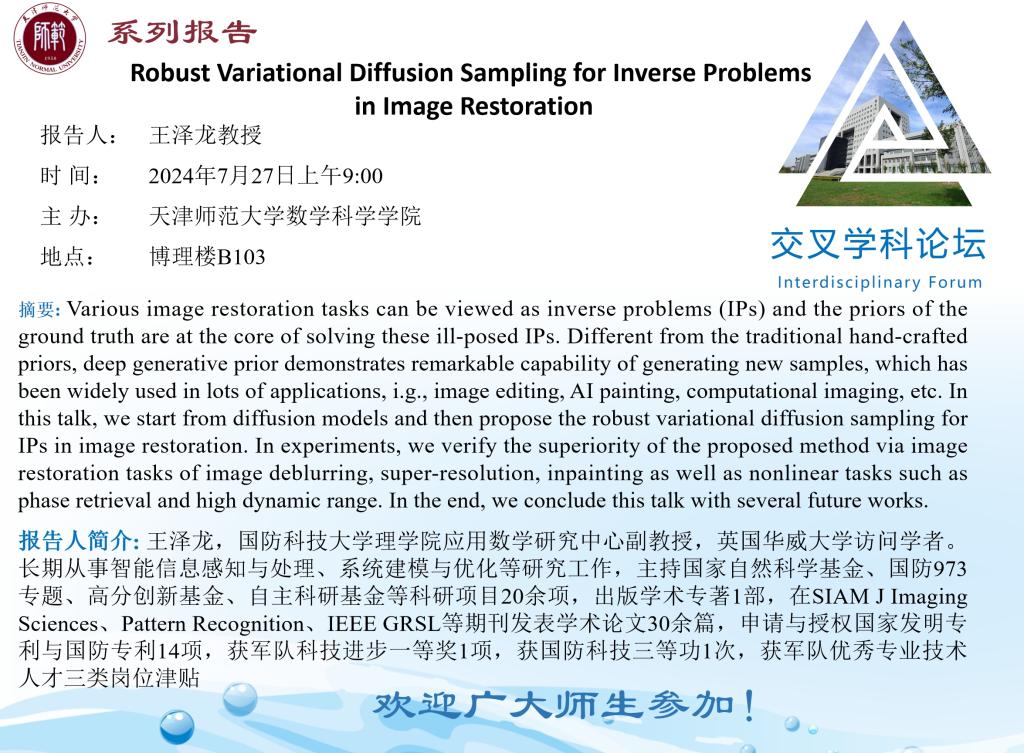 【预告】学术报告(2024-13)7月27日——Robust Variational Diffusion Sampling for Inverse Problems in Image Restoration