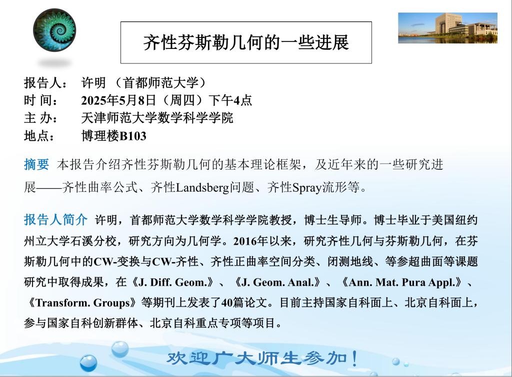【预告】学术报告(2025-14)5月8日——齐性芬斯勒几何的一些进展
