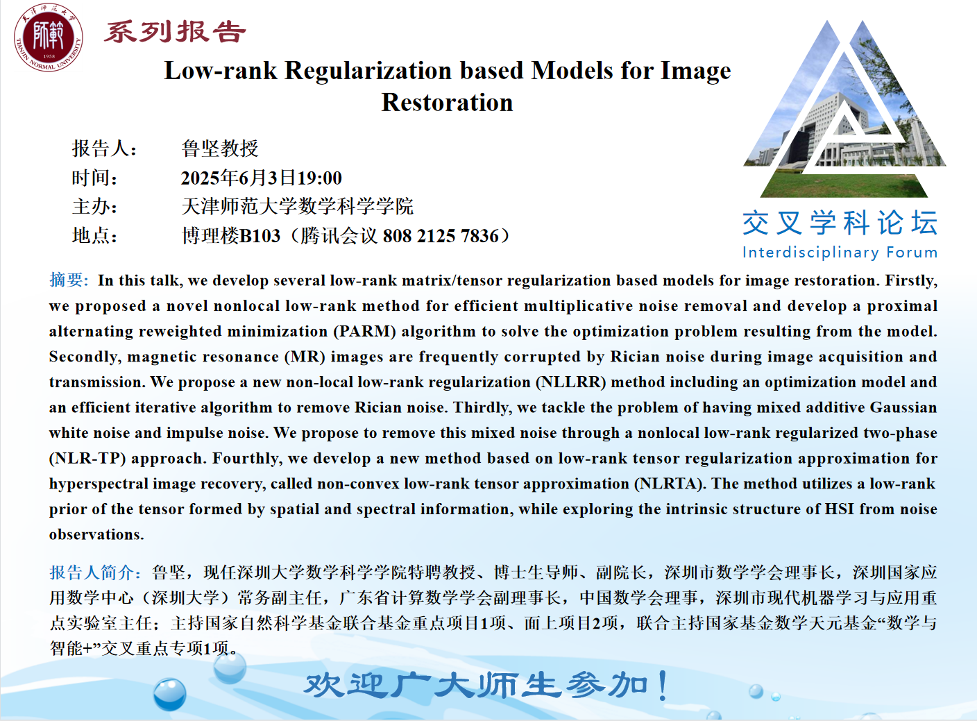 【预告】学术报告(2025-23)6月3日——Low-rank Regularization based Models for Image Restoration