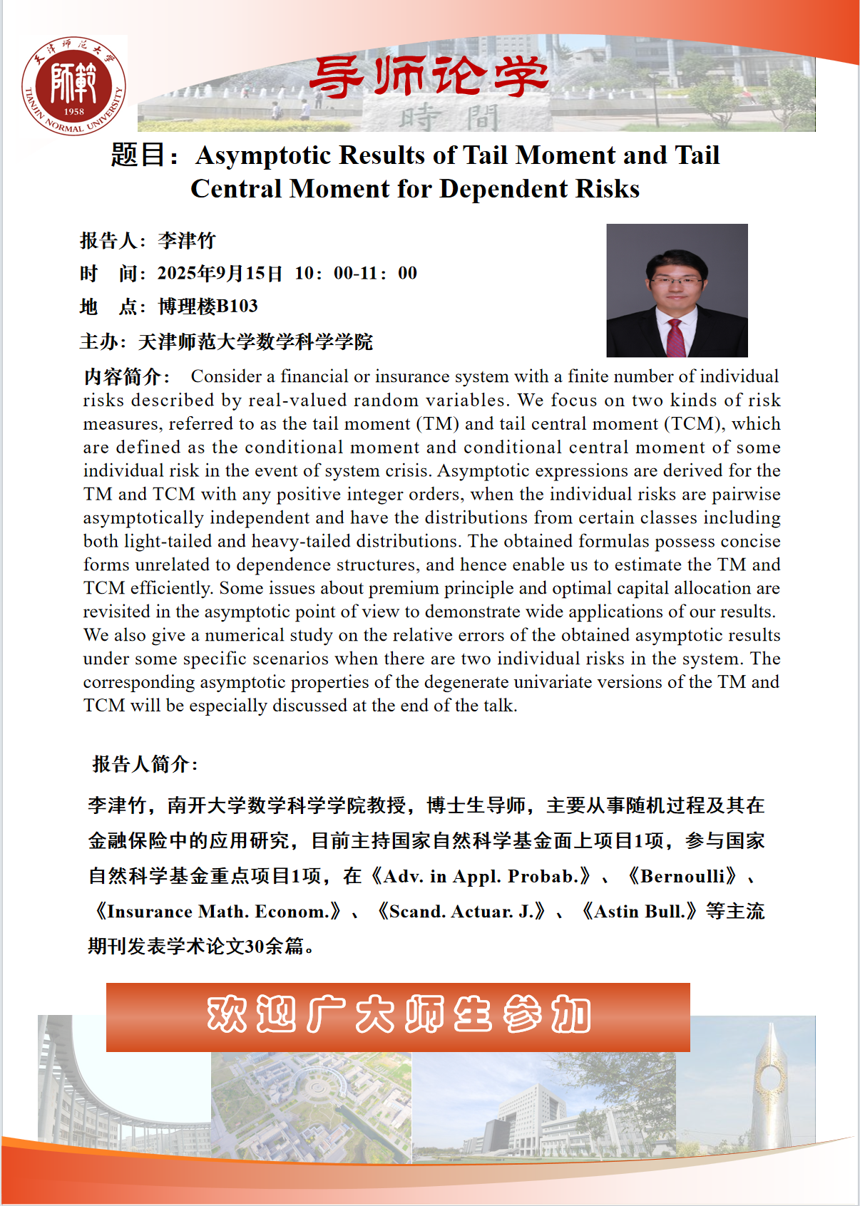 【预告】学术报告(2025-39)9月15日-Asymptotic Results of Tail Moment and Tail Central Moment for Dependent Risks
