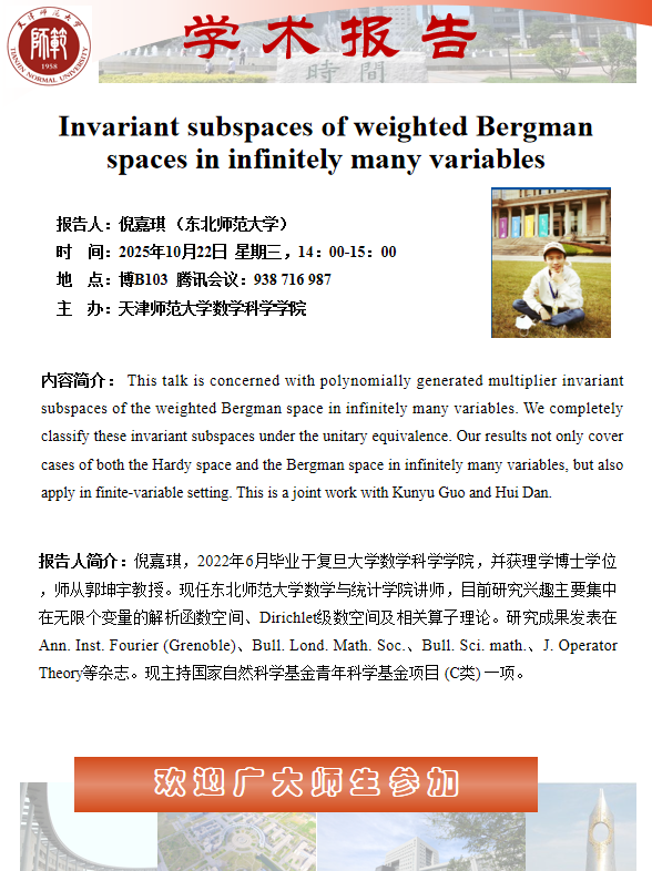 【预告】学术报告(2025-43)10月22日-Invariant subspaces of weighted Bergmanspaces in infinitely many variables