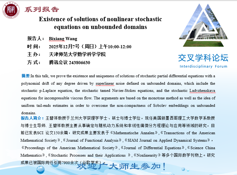 【预告】学术报告(2025-52)12月7日--Existence of solutions of nonlinear stochasticequations on unbounded domains