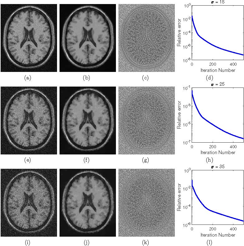 磁共振成像在医学图像处理中有着广泛的应用。含噪声的磁共振数据通常建模为Rician分布。因此,通常把从含噪声的磁共振图像中估计出干净图像的过程称为Rician噪声去除。由于Rician噪声对信号的依赖性,直接提取干净图像具有很大的挑战。该文提出了一种新的变分方法来去除磁共振成像中的Rician噪声。该文首先探讨复值图像(complex images)的高斯噪声去除和幅度图像(magnitude images)的Rician噪声去除之间的联系,然后通过信噪分离建立约束优化模型。该文中的模型不同于以往的基于最大后验概率的模型,后者使用Rician分布概率密度函数建模,不可避免地包含复杂的贝塞尔函数,导致模型求解时需要很高的计算成本。该文采用能保证收敛的交替乘子方向法求解所提出的球面约束优化模型。与现有变分方法的数值比较表明,该文方法在图像恢复质量方面效果相当,但平均节省了约50%的总计算成本。