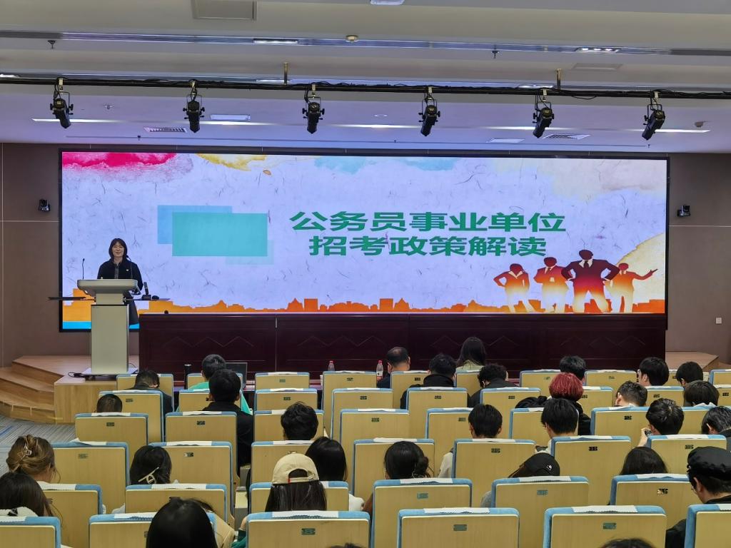 在就业政策宣讲会上,河东区人力资源和社会保障局副局长尚琳、河东区公共就业(人才)服务中心部长孙轶恺、中天人力中天人力毕业生服务部陶红辉、河东区公共就业(人才)服务中心副部长蔡玉欣分别就公务员事业单位招考和岗位选择、高校毕业生就业见习、毕业生档案、毕业生创业扶持等内容进行解读。来自suncitygroup太阳成集团、新闻传播公司、文公司的在校生共计200余人聆听宣讲会。
