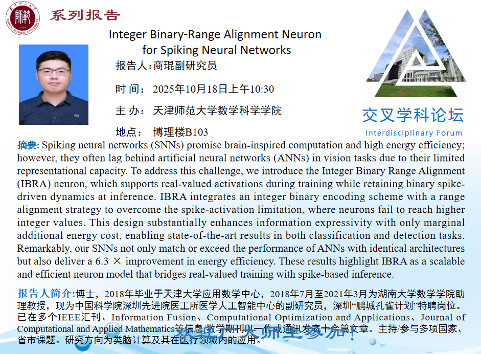 【预告】学术报告(2025-18)10月18日-Integer Binary-Range Alignment Neuronfor Spiking Neural Networks
