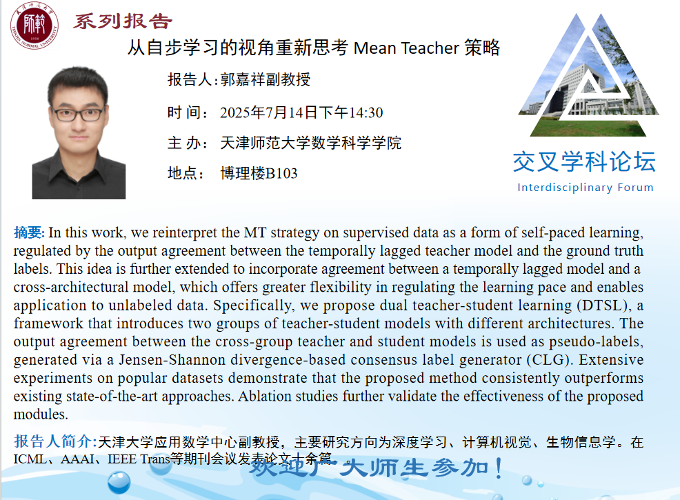 【预告】学术报告(2025-9)7月14日——从自步学习的视角重新思考Mean Teacher策略