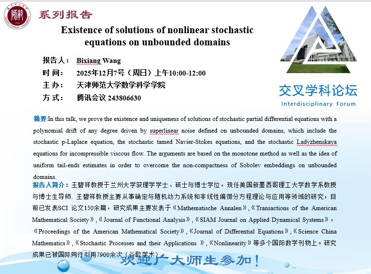 【预告】学术报告(2025-26)12月7日--Existence of solutions of nonlinear stochasticequations on unbounded domains